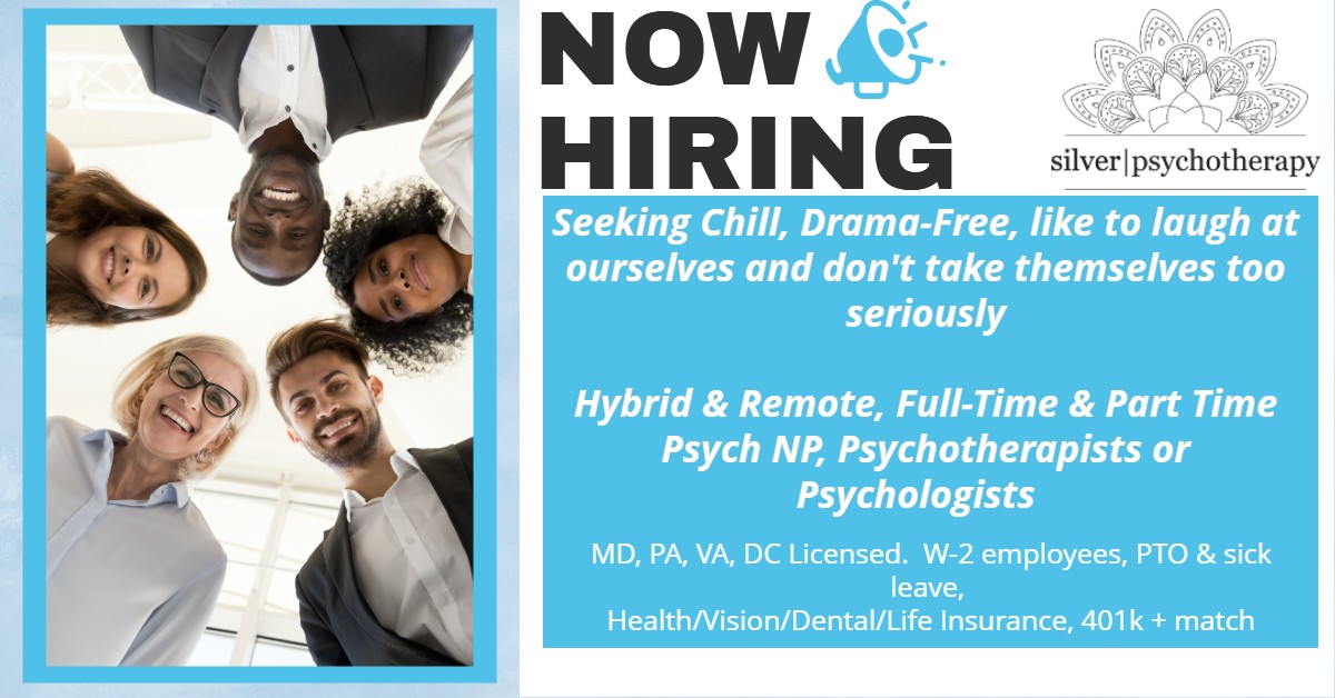 Silver Psychotherapy, a group private practice in Maryland, is made up of chill, drama-free, like to laugh at ourselves, providers who don’t take themselves too seriously. We are looking for full-time/part-time remote and in person Therapists/Psychologist to join our group practice.