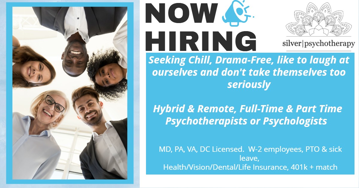Silver Psychotherapy, a group private practice in Maryland, is made up of chill, drama-free, like to laugh at ourselves, providers who don’t take themselves too seriously. We are looking for full-time/part-time remote and in person Therapists and Psychologists to join our group practice.