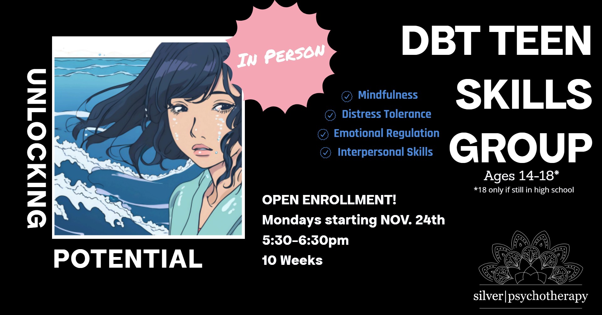 Our next DBT group for teens will begin on Nov 24th and run for 10 weeks in person. We will bill insurance for the group if you have BCBS, Aetna, Cigna, United. Please email k.clark@silverpsychotherapy with any questions.